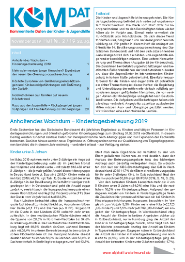 Die Kindertagesbetreuung befindet sich weiter auf ungebremstem Wachstumskurs. Ob sich dieser Trend fortsetzen wird, hängt auch von der demografischen Entwicklung ab. Wir greifen daher auch die 14. Bevölkerungsvorausberechnung des Statistischen Bundesamts auf. Eine andere Herausforderung und Thema dieser Ausgabe ist der Kinderschutz. Die Zunahmen bei Gefährdungseinschätzungen und bestimmten Fallkonstellationen der Inobhutnahmen deuten an, dass die Jugendämter im intervenierenden Kinderschutz in hohem Maße gefordert sind. Ebenfalls herausfordernd für die Kinder- und Jugendhilfe ist schließlich ein dritter Themenkomplex dieses Heftes: die veränderten Bedarfslagen bei der Begleitung und Unterstützung der mittlerweile vielfach volljährig gewordenen jungen geflüchteten Menschen.