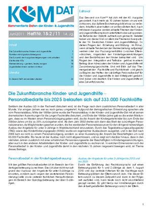 Das Gewand von KomDat hat sich mit der 40. Ausgabe gewandelt. Nach mehr als 10 Jahren haben wir uns entschlossen, das äußere Erscheinungsbild etwas zu verändern. Inhaltlich aber halten wir an Bewährtem fest. Auch mit dieser Ausgabe werden aktuelle Themen der Kinder- und Jugendhilfe empirisch unterfüttert oder auf spannende Befunde der Statistik aufmerksam gemacht. Geleitet haben uns dieses Mal vor allem die Themenschwerpunkte des 14. Deutschen Kinder- und Jugendhilfetags. So stehen Fragen der »Erziehung und Bildung« im Fokus, wenn aktuelle Tendenzen der Heimerziehung aufgezeigt werden oder das Passungsverhältnis zwischen Elternwünschen, Angeboten der Kindertageseinrichtungen und den Bedürfnissen der Kinder betrachtet wird. Um Fragen der »Integration und Teilhabe« geht es in einem Beitrag über Adressaten der Kinder- und Jugendhilfe mit Zuwanderungsgeschichte. Und mit Blick auf das Themengebiet der »Fachkräfte und Fachlichkeit« wird gleich zu Beginn des Heftes der zukünftige Personalbedarf für die Kinder- und Jugendhilfe in den Mittelpunkt gerückt. Und dabei wird deutlich: Die Kinder- und Jugendhilfe ist eine Zukunftsbranche.