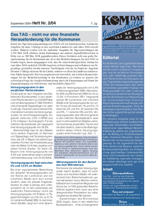 Durch das Tagesbetreuungsausbaugesetz (TAG) soll ein bedarfsgerechter Ausbau der Angebote für unter 3-Jährige in den westlichen Ländern bis zum Jahre 2010 erreicht werden. Dadurch werden sich die laufenden Ausgaben für Tageseinrichtungen um 1,765 Mrd. EUR erhöhen, denen Entlastungen aus anderen Jugendhilfebereichen in Höhe von ca. 209 Mio. EUR gegenüberstehen. Dieses Vorhaben stellt eine große Herausforderung für die Kommunen dar, da in den Modellrechnungen, die dem TAG zu Grunde liegen, davon ausgegangen wird, dass für einen bedarfsgerechten Ausbau bis zum Jahre 2010 zusätzlich 230.000 Angebote in Einrichtungen und im Rahmen von Tagespflege geschaffen werden müssten. Nachfolgend wird der Ist-Stand der Angebote für unter 3-Jährige nicht nur für die Länder, sondern vor allem für Landkreise und kreisfreie Städte dargestellt. Hiervon ausgehend wird entwickelt, mit welchen Herausforderungen bei der Bedarfsfeststellung in den Kommunen zu rechnen ist, jenseits der schwierigen Frage der Ausgleichsfinanzierung durch die Einsparungen auf Grund der Zusammenlegung von Arbeitslosen- und Sozialhilfe (Hartz IV).