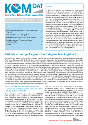 In der vom 14. Kinder- und Jugendbericht vorgelegten Analyse zum Aufwachsen in „neuer Verantwortung“ benennen die Sachverständigen einen bedarfsgerechten Ausbau von Bildungs-, Betreuungs- und Erziehungsangeboten für das erste Lebensjahrzehnt sowie eine davon nicht zu trennende Qualitätsentwicklung als eine der zentralen Leitlinien. Für den wichtigen Bereich der frühkindlichen Bildung, Betreuung und Erziehung sind die empirischen Trends erfreulich stabil und weisen in die richtige Richtung, auch wenn vielfach noch Verbesserungsbedarf besteht – etwa beim Austarieren von Angebot und Nachfrage, bei der Tagespflege oder bei der Personalentwicklung im Bereich der Frühpädagogik. Doch die Beiträge der aktuellen Ausgabe zeigen: Der anhaltende U3-Ausbau, die Ausweitung der Ganztagsbetreuung im Kindergartenalter sowie eine weitere Zunahme des Personals, die nicht nur auf eine Erhöhung bei den Platzkapazitäten zurückzuführen ist, sind ermutigende Signale für eine bessere Bildung und Teilhabe von Kindern im Kleinkindalter. Insofern scheint der Ausbau der Kindertagesbetreuung auf der Basis der Daten aus dem Frühjahr 2013 auf einem guten Weg.