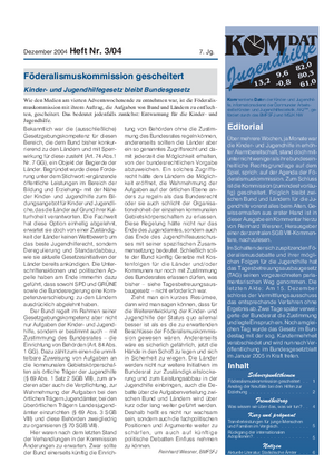 Über mehrere Wochen, ja Monate war die Kinder- und Jugendhilfe in erhöhter Alarmbereitschaft, stand doch mitunter nicht weniger als ihre bundeseinheitliche Rechtsgrundlage auf dem Spiel, sprich: auf der Agenda der Föderalismuskommission. Zum Schluss ist die Kommission (zumindest vorläufig) gescheitert. Folglich bleibt zwischen Bund und Ländern für die Jugendhilfe vorerst alles beim Alten. Gewissermaßen aus erster Hand ist in dieser Ausgabe ein Kommentar hierzu von Reinhard Wiesner, Herausgeber einer zentralen SGB VIII-Kommentare, nachzulesen.