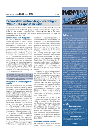 Nachdem in den Jahren 2001 und 2002 die öffentlichen Ausgaben für die Kinder- und Jugendhilfe noch um 4% bzw. 5% gestiegen sind, fiel die Zunahme der Ausgaben zwischen 2002 und 2003 mit 2,2% geringer aus. Zwischen 2003 und 2004 hat der Ausgabenanstieg nun ein vorläufiges Ende gefunden. Preisbereinigt ergibt sich sogar ein Ausgabenrückgang um 1,3%.