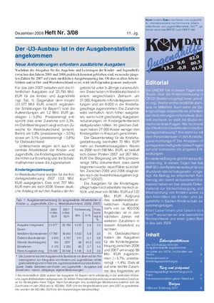 Die UNICEF hat in diesen Tagen eine Studie über die Kinderbetreuung in OECD-Staaten vorgelegt (www.unicefirc.org). Wieder einmal landet Deutschland im Mittelfeld. Auch wenn die Datengrundlage angesichts der anhaltenden Veränderungen schon etwas überholt erscheint, so stellt die Studie immerhin zentrale Fragen: Wie hoch sind die öffentlichen Investitionen in die Kindertagesbetreuung? Wie steht es mit dem Personaleinsatz in den Kindertageseinrichtungen? Die Analysen im vorliegenden Heft greifen diese Fragen auf und bilanzieren die jüngsten Entwicklungen.