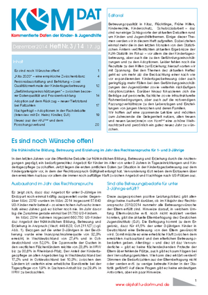 Betreuungsqualität in Kitas, Flüchtlinge, Frühe Hilfen, Kinderrechte, Kinderschutz, Schulsozialarbeit – das sind nur einige Schlagworte der aktuellen Debatten rund um Kinder- und Jugendhilfethemen. Einige dieser Themen werden wir in diesem Heft aufgreifen. Dabei stehen einmal mehr die in den letzten Monaten von den Statistischen Ämtern veröffentlichten aktuellen Ergebnisse der KJH-Statistik im Fokus – vor allem die der Kindertages-betreuung, aber auch die zu den Gefährdungseinschätzungen und zu den Adoptionen. Leider fehlen noch die Resultate zu den Hilfen zur Erziehung; hierauf warten wir mit Spannung. Bei den Themen des aktuellen Heftes geht es um mehr als die Beobachtung einer nach wie vor expandierenden Kindertagesbetreuung oder auch geringfügig mehr Fällen bei den Gefährdungseinschätzungen der Jugendämter sowie weiterhin rückläufigen Adoptionszahlen. Darüber hinaus fokussieren sich die Beiträge auf personelle, fachliche sowie infrastrukturelle Rahmenbedingungen, aber auch auf die notwendigen Passungsverhältnisse zu den Lebenslagen und Einstellungen von jungen Menschen und deren Familien. Wir hoffen auf eine spannende Lektüre und möchten zum Jahresende die Gelegenheit nutzen, allen treuen und neuen Leser(inne)n von KomDat eine schöne Weihnachtszeit und persönlich ein gutes neues Jahr zu wünschen.