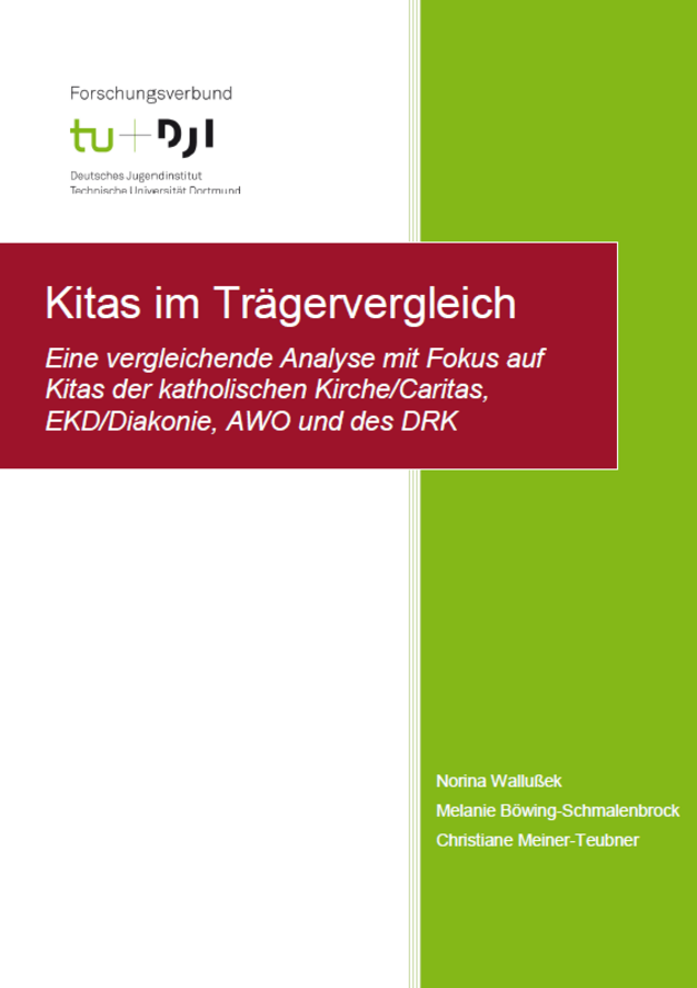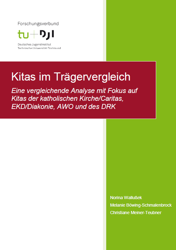 Wallußek, N./Böwing-Schmalenbrock, M./Meiner-Teubner, C. (2022): Kitas im Trägervergleich. Eine vergleichende Analyse mit Fokus auf Kitas der katholischen Kirche/Caritas, EKD/Diakonie, AWO und des DRK, Dortmund URL: https://www.forschungsverbund.tu-dortmund.de/fileadmin/user_upload/Plaetze._Personal._Finanzen._Teil_2_revidiert.pdf [Download]
