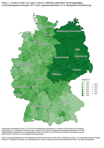 Die Angebote sowie die Inanspruchnahme frühkindlicher Bildung, Erziehung und Betreuung der Kinder im Alter von unter 11 Jahren in Kindertageseinrichtungen, Kindertagespflege und Horten unterscheidet sich deutlich zwischen den Jugendamtsbezirken. Daher wertet die Arbeitsstelle Kinder- und Jugendhilfestatistik des Forschungsverbundes DJI/TU Dortmund die Daten der amtlichen Kinder- und Jugendhilfestatistik für die Jugendamtsbezirke aus und stellt regelmäßig ausgewählte Ergebnisse zur Verfügung.