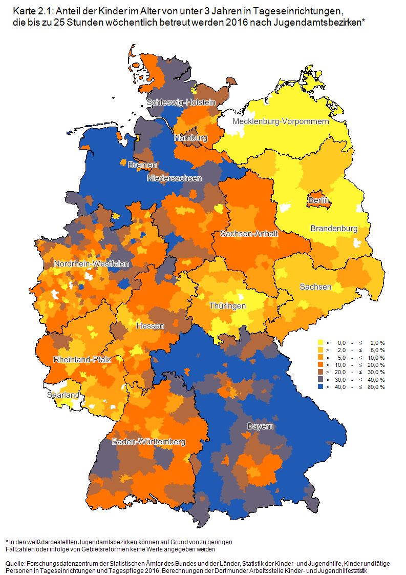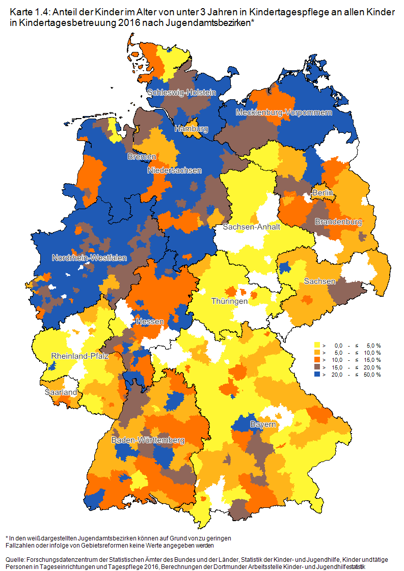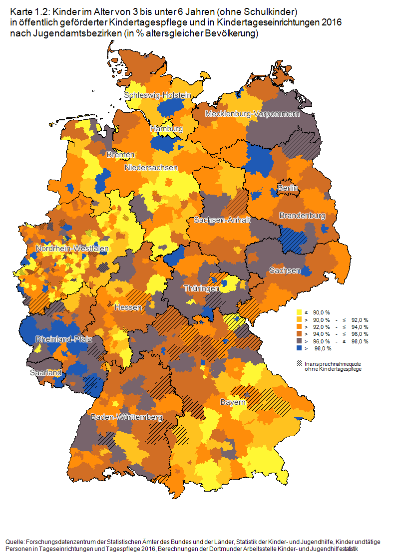 Seit dem Jahr 2008 werden die Daten für die Jugendamtsbezirke ausgewertet und in der Reihe „Kindertagesbetreuung vor Ort – Der Betreuungsatlas“ publiziert. Der Betreuungsatlas liegt für die Jahre 2008, 2010, 2011, 2012, 2013, 2014, 2015, 2016 vor.
