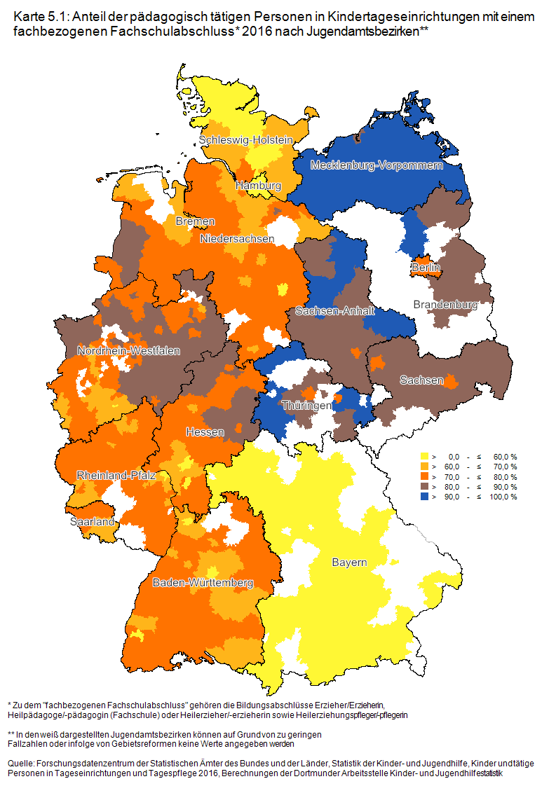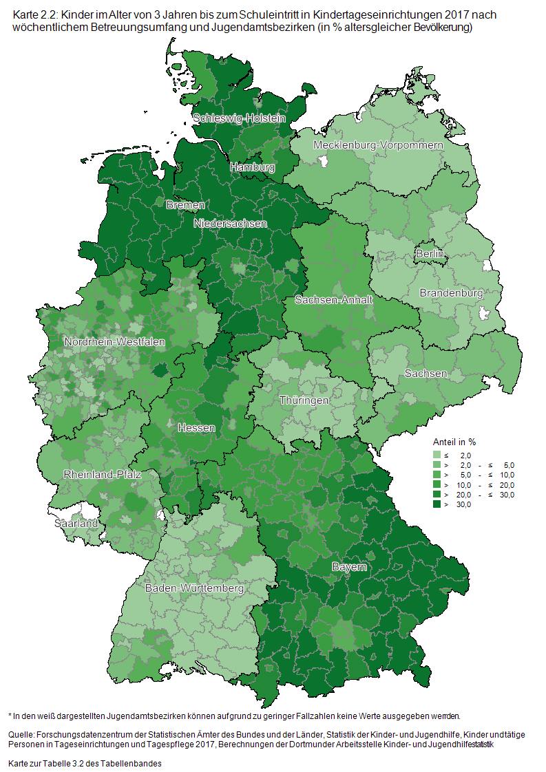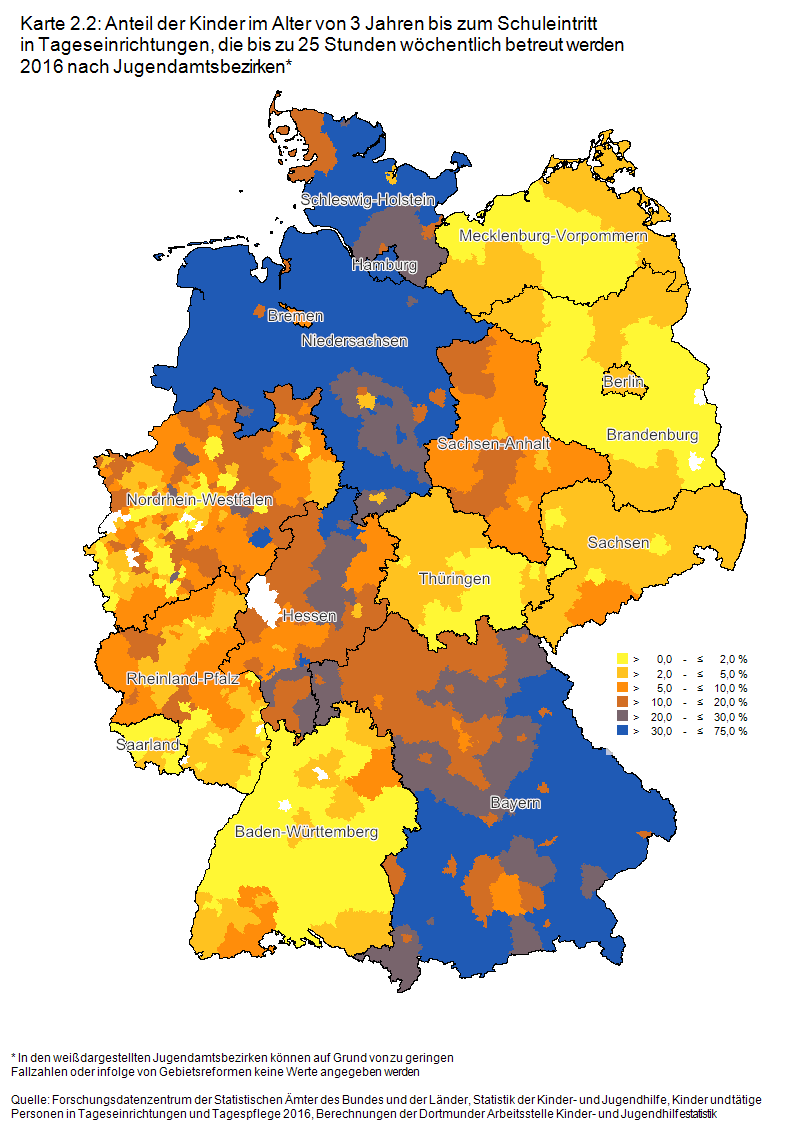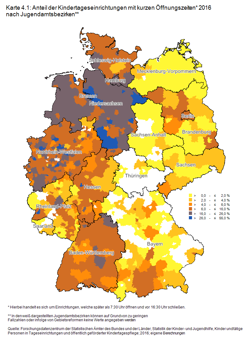 Seit dem Jahr 2008 werden die Daten für die Jugendamtsbezirke ausgewertet und in der Reihe „Kindertagesbetreuung vor Ort – Der Betreuungsatlas“ publiziert. Der Betreuungsatlas liegt für die Jahre 2008, 2010, 2011, 2012, 2013, 2014, 2015, 2016 vor.