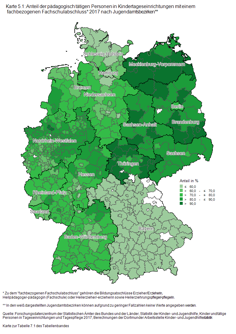 Karte 1.2: Kinder im Alter von 3 bis unter 6 Jahren (ohne Schulkinder) in öffentlich geförderter Kindertagespflege und in Kindertageseinrichtungen 2017 nach Jugendamtsbezirken (in % altersgleicher Bevölkerung)