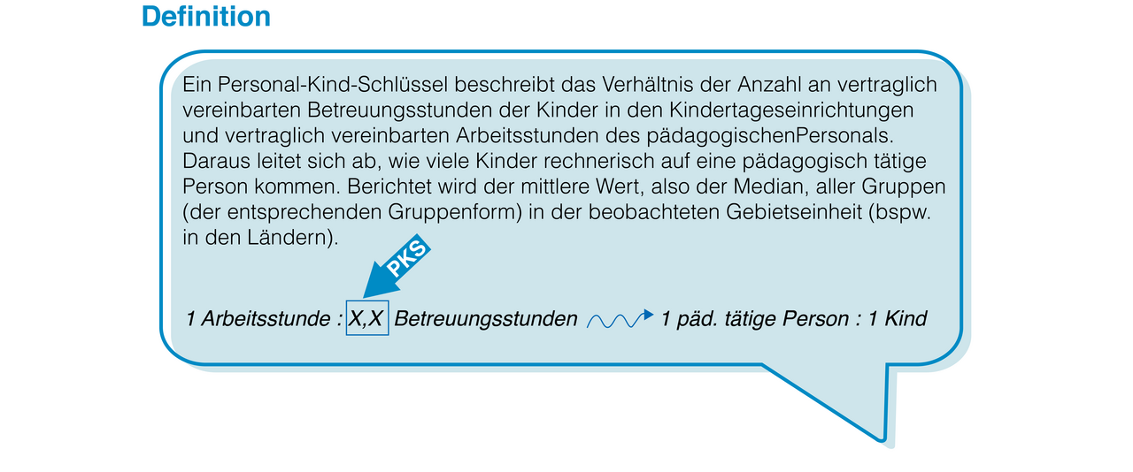 Zur Bemessung der Personalausstattung können u. a. Personal-Kind-Schlüssel (PKS) herangezogen werden. Diese werden von der AKJStat mit den Daten der amtlichen Kinder- und Jugendhilfestatistik berechnetet und für verschiedene Gruppenformen ab dem Jahr 2012 ausgewiesen. Die gruppenbezogenen Personal-Kind-Schlüssel (PKS) in Kindertageseinrichtungen sind zentrale Kennzahlen im Rahmen der Debatte um die Qualität der Frühen Bildung. Sie werden unter anderem in der nationalen Bildungsberichterstattung, den Fachkräftebarometern Frühe Bildung, den Kinder- und Jugendhilfereporten oder den Berichten zum Monitoring des KiQuTG aufgegriffen. Es handelt sich bei den PKS um rechnerische Größen, die auf den vertraglich vereinbarten Betreuungsumfängen auf Seiten der Kinder und den vertraglich vereinbarten Beschäftigungsumfängen auf Seiten des pädagogisch tätigen Personals beruhen. Sie zeigen somit das Verhältnis zwischen den personellen Ressourcen und den angemeldeten Kindern in den Gruppen auf. Dabei wird das gesamte pädagogisch tätige Personal in der jeweiligen Gruppe berücksichtigt (nicht nur Fachkräfte), die Arbeitszeit der Einrichtungsleitungen wird dagegen nicht eingerechnet. Da die vertragliche Situation abgebildet wird, geben die PKS keine Auskunft zur Face-to-Face-Situation zu bestimmten Uhrzeiten im Laufe eines Kita-Tages.