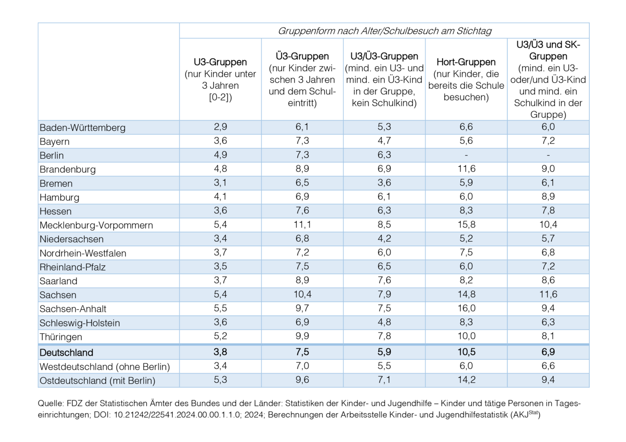 Die Personal-Kind-Schlüssel werden jährlich für verschiedene Gruppenformen und in der Regel auf Länderebene berichtet. Im Folgenden ist eine Zeitreihe für Gruppen mit unter 3-Jährigen und Gruppen mit Kindern ab 3 Jahren bis zum Schuleintritt abgebildet sowie eine differenzierte Tabelle mit den aktuellsten Personal-Kind-Schlüsseln 5 Gruppenformen auf Länderebene.