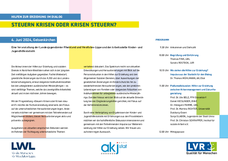 Am 4. Juni 2024 fand die Fachtagung zu den Hilfen zur Erziehung in NRW „Steuern Krisen oder Krisen steuern? Hilfen zur Erziehung im Dialog“ in Kooperation der beiden Landesjugendämter Westfalen-Lippe und Rheinland sowie der Arbeitsstelle Kinder- und Jugendhilfestatistik im Wissenschaftspark in Gelsenkirchen statt.